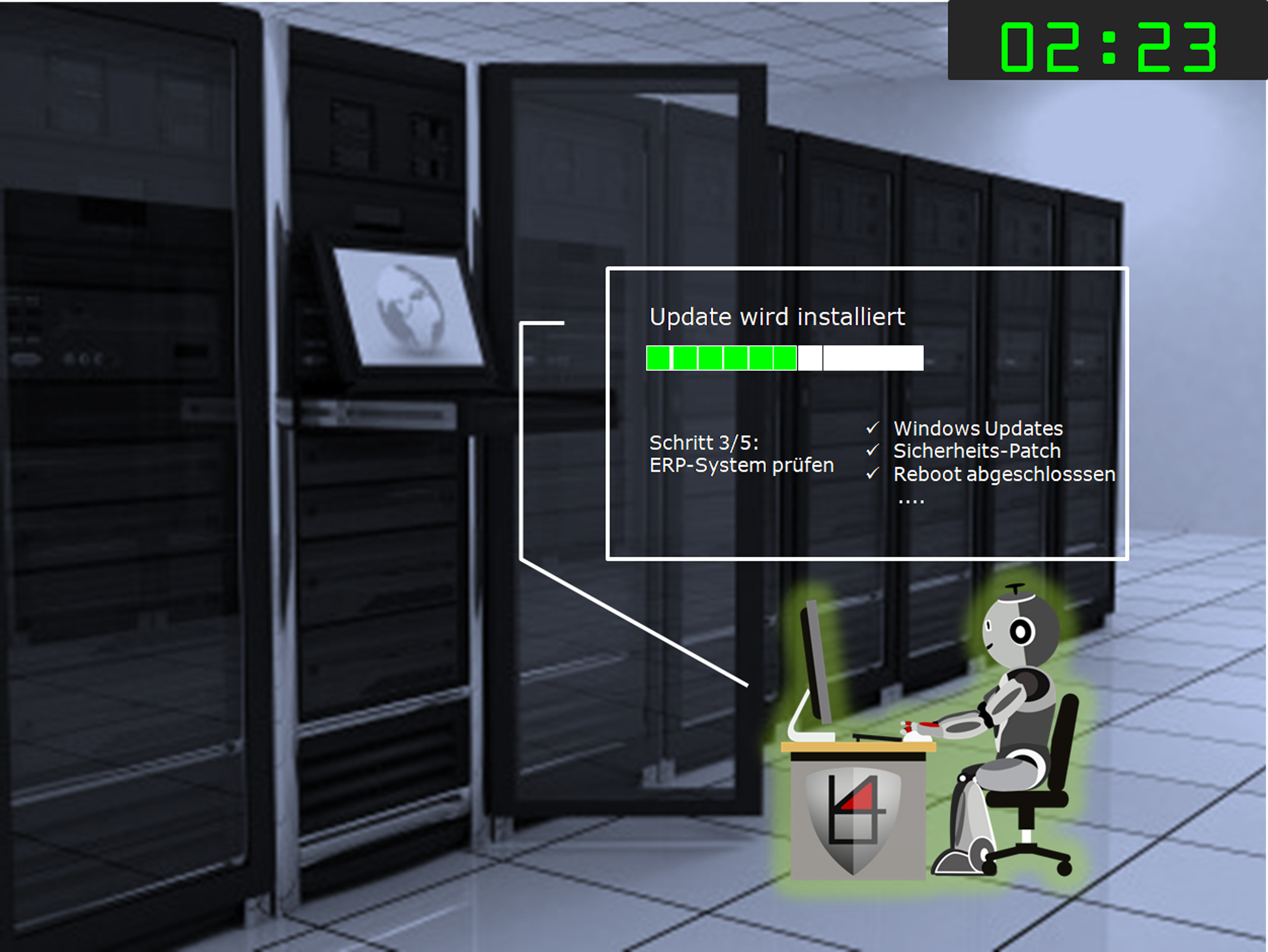 Mit den b4 Bots von AmdoSoft lassen sich diese Prozesse vollständig automatisieren. Die Software-Roboter führen die Updates in zuvor definierten Zeitfenstern durch – typischerweise nachts oder an Wochenenden – und übernehmen alle erforderlichen Schritte: